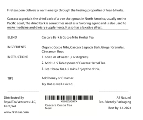 FIRE TEAS Cascara Sagrada & Cocoa Herbal Tea - Organic Cascara Sagrada Bark, Cocoa Nibs, Cinnamon, Ginger - Laxative, Cooling -
