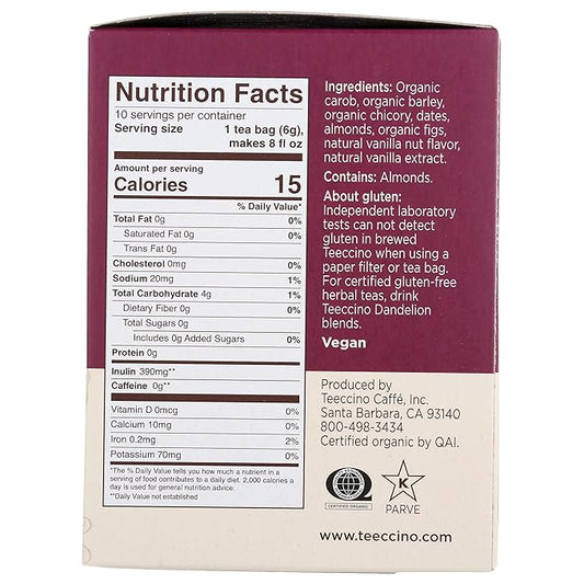 Teeccino Vanilla Nut Herbal Tea, 25 Tea Bags - Rich & Roasted Herbal Tea That’s Caffeine Free & Prebiotic for Natural Energy, 3X more Herbs, Acid Free, Great Hot or Iced