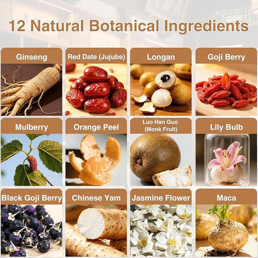 Premium Ginseng Tea - Natural Organic Kidney and Liver Detox Tea - 12 Herbal Blend with Goji Berry,Jujube, Longan, Mulberry & Maca - Caffeine & Sugar Free - 25 Individually Wrapped Pyramid Large Tea Bags (250g)