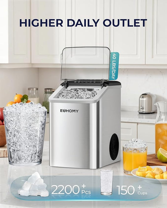 EUHOMY Nugget Ice Maker Countertop, Max 40lbs/Day, Auto-Cleaning, 2Qt Reservoir, Compact Sonic Ice Maker with 2.5lbs Basket and Scoop, Soft Chewable Nugget Ice for Home/Party/RV/Camping (Stainless)