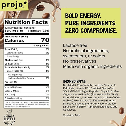 Projo* Power Coffee – Instant Coffee with 11g Protein – Grass-Fed Hydrolyzed Bovine Collagen & 175mg Caffeine – Mocha Latte Flavor – Organic – Energy Support – 12 Single-Serve Packets