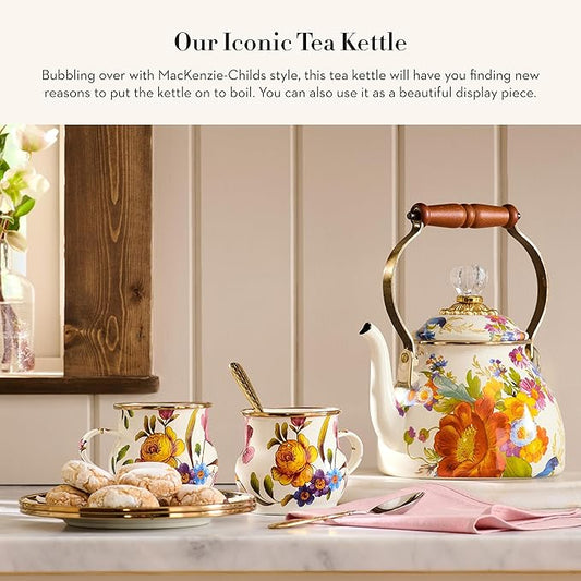 MACKENZIE-CHILDS Enamel Tea Kettle, Stylish Tea Kettle for Stovetop, White Flower Market, 2 Quarts