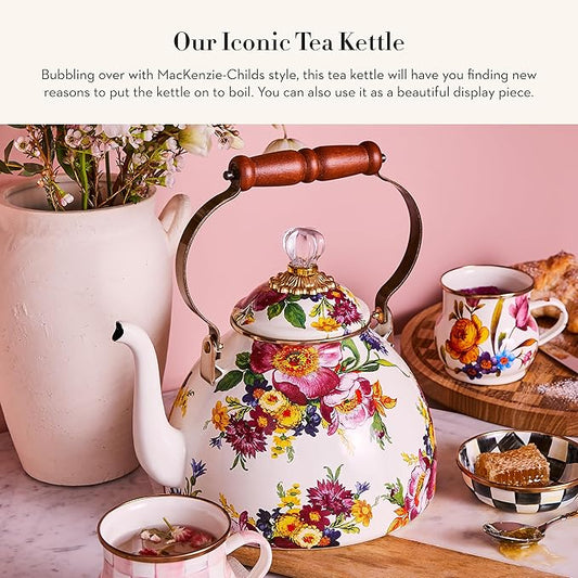 MACKENZIE-CHILDS Enamel Tea Kettle, Stylish Tea Kettle for Stovetop, White Flower Market, 3 Quarts