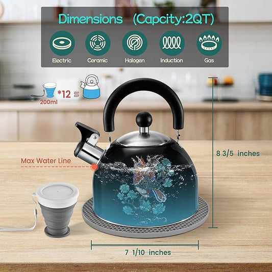 ARC Stainless Steel Whistling Tea Kettle for Stovetop, Magic Color Changing Design Teapot for Stovetop, 2 Quart Black Tea Kettle with Silicone Trivet Mat for Heat Resistant & Folding Cup