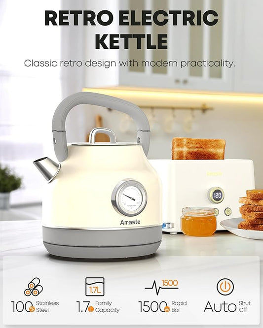 Amaste Electric Kettle, Retro Electric Tea Kettle With Thermometer, 57 Oz Hot Water Kettle For Coffee & Tea, 304 Stainless Steel, 1500w Fast Boiling, Auto Shut-Off & Boil Dry Protection, Cream White