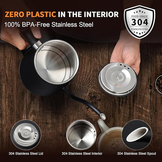 Gooseneck electric kettle,Auto Boil Detection, with Variable Temperature Control, Stainless Steel Inner, Ultra-Quiet 304 Stainless Steel,1200W Quick Heating, for Coffee, Tea & Milk, 0.9L(Black)