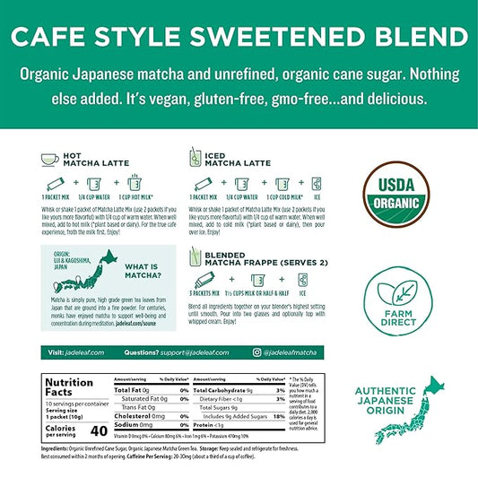 Jade Leaf Organic Matcha Latte Mix - Cafe Style Sweetened Blend - Sweet Matcha Green Tea Powder - 100ct Single Serve Stick Packs