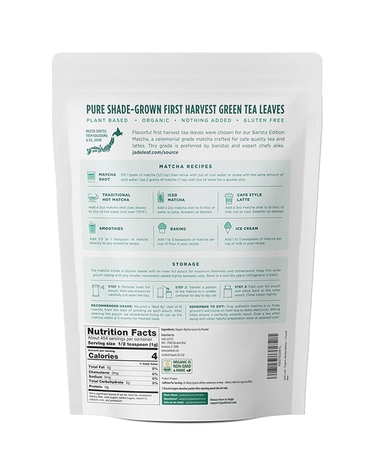 Jade Leaf Matcha Organic Ceremonial Grade Matcha Green Tea Powder - Authentic Japanese Origin - Barista Edition For Cafe Quality Tea & Lattes (1 Pound Bulk Pouch)