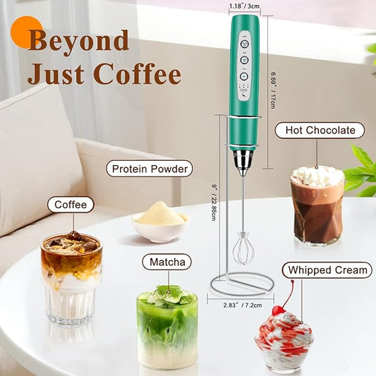 Milk Frother Handheld Rechargeable with Stand, Frother Wand Drink Mixer Electric Whisk for Coffee, Detachable With 3 Stainless Whisks, Hand Mixer for Lattes, Cappuccino, Matcha, Egg, Green