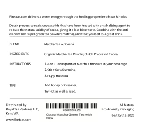 FIRE TEAS Chocolate Matcha Green Tea Powder (90 grams) - Smooth Cocoa Mix with Green Tea Powder -