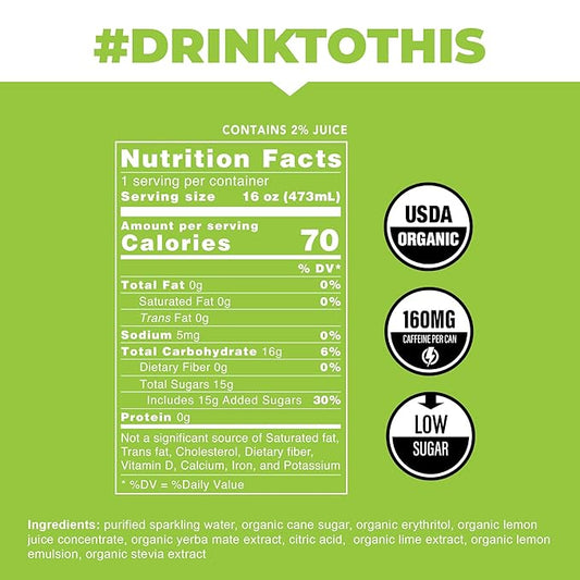 CLEAN Cause Low Calorie Lemon Lime USDA Organic Sparkling Yerba Mate Tea (16oz cans, 12-Pack Case) Low Sugar, 160mg Caffeine, Healthy Alternative to Soda & Energy Drinks.