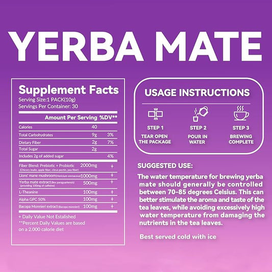 Yerba Mate Instant Tea Powder - Raspberry Peach Flavor - Gut Health & Clean Energy Super Drink with Nootropics, Prebiotics & Probiotics - Energy Boost & Focus - 30 Sticks (300g)