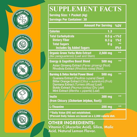 Yerba Mate 4000mg, 10 in 1 Super Yerba Mate Tea Instant Powder - No Sugar, Clean Energy with No Crash, Stay Refreshed and Focused, Gut Health, with Ginseng, Rhodiola, Prebiotic, L-Theanine, 30 Packets
