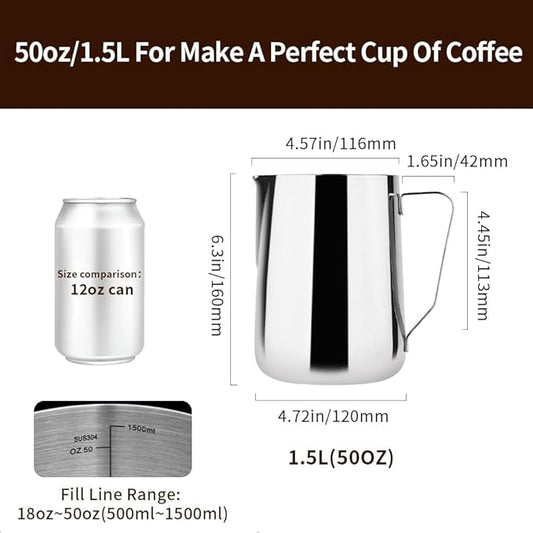watchget Milk Frothing Pitcher 50oz/1500ml - Stainless Steel Espresso Steaming Pitcher for Cappuccino, Latte Art, Coffee Machine Accessories Milk Jug Frother Cup, Silver
