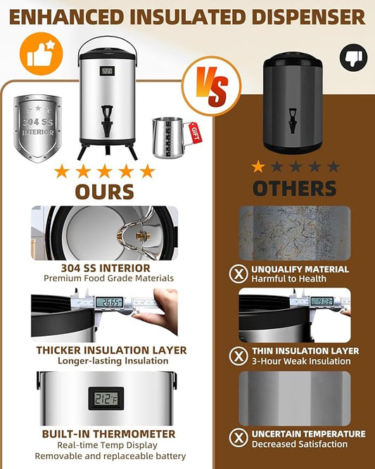 Insulated Beverage Dispenser, 12L/3.2gallon 304 thickened food-grade stainless steel Hot Drink Dispenser, Hot&Cold water urn with thermometer faucet for hot tea&coffee, cold milk, water, juice(Black)