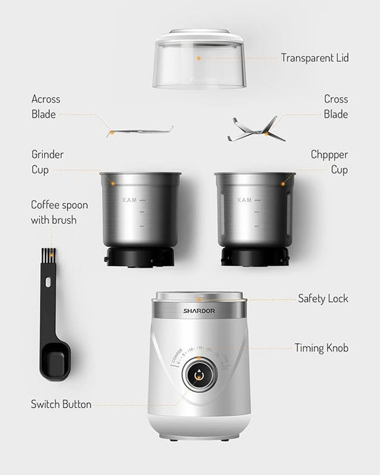 SHARDOR Electric Super Silent Blade Coffee Grinder, Timed Grind Control Rotary Knob, Adjustable Coarse to Fine for Coffee Beans, Spices & Herbs, with 2 Removable Stainless Steel Bowl, White