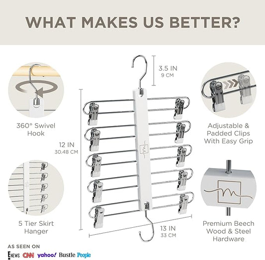 MORALVE Skirt Hangers Space Saving with Clips - 2 Pack - European Beechwood 5-Tier Hanger for Shorts, Skirts, and Pants - Closet Organizer and Storage Solution for Women with 360° Swivel Hook