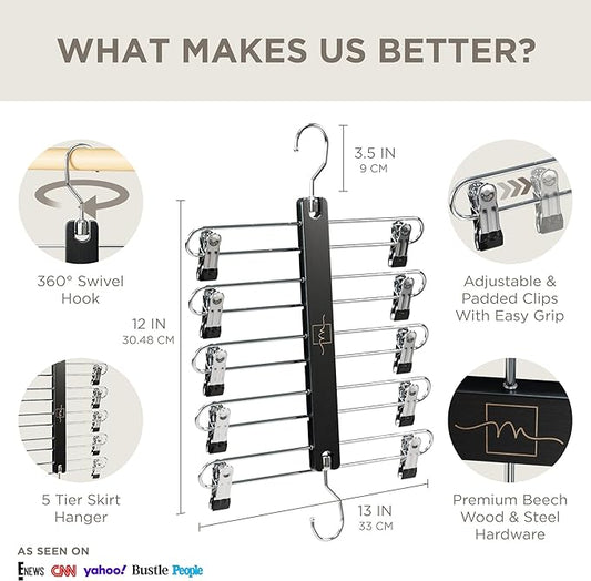 MORALVE Skirt Hangers Space Saving with Clips - 2 Pack - European Beechwood 5-Tier Hanger for Shorts, Skirts, and Pants - Closet Organizer and Storage Solution for Women with 360° Swivel Hook