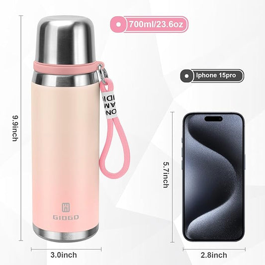 Stainless Steel thermo Bottles with cup 700ml/23.7oz Vacuum Insulated Bottle for hot and cold coffee drink water thermo flask with cup.(Gradient Pink,700ml)