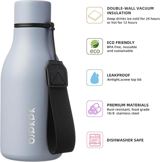 BJPKPK Insulated Water Bottles, 12oz Stainless Steel Metal Water Bottle with Strap, BPA Free Leak Proof Jugs, Mugs, Flasks, Reusable Thermal Flasks for Sports & Travel, Mist Grey