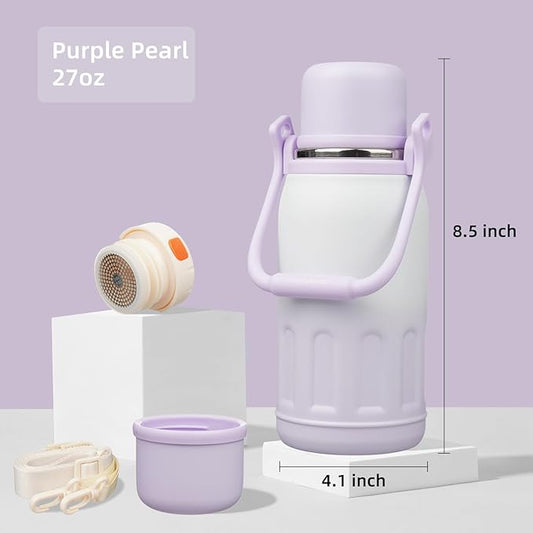 Insulated Water Bottle with Handle and Strap,Vacuum Travel Tumbler with Cup Lid,Thermo Coffee Cup for Hot Cold Drinks 27 OZ,Purple Pearl