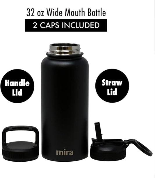 MIRA 32 oz Insulated Water Bottle - Stainless Steel Sports Flask with 2 Lids (Straw & Handle) - Cold Drink Thermo - Black
