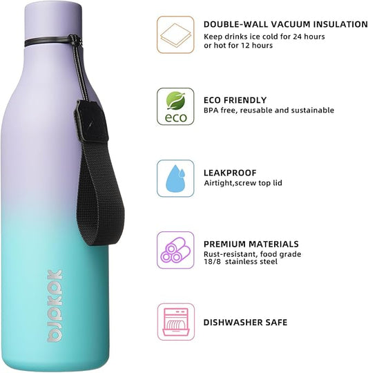 BJPKPK Insulated Water Bottles, 18 oz Stainless Steel Metal Water Bottle with Strap, BPA Free Leak Proof Jugs, Mugs, Flasks, Reusable Thermal Flasks for Sports & Travel, Blue Lagoon