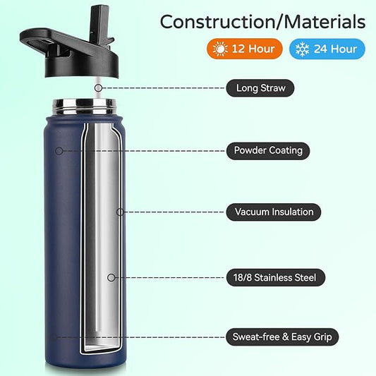 DOMICARE Insulated Water Bottle, 22 oz Vacuum Insulated Stainless Steel Reusable Sports Bottle with Straw Lid & Spout Lid for Travel, Camping, Bike, Leakproof, Navy Blue, 4 Pack