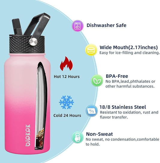 BJPKPK 2 Pack Insulated Water Bottles with Straw Lids, 27oz Stainless Steel Metal Water Bottle with 6 Lids, Leak Proof BPA Free Jugs, Cups, Flasks for Travel, Sports (Cherry+Black)