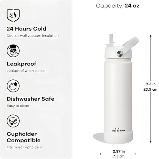 mininoo Insulated Stainless Steel Water Bottle with Straw and Lid for Sports, 24 oz, White
