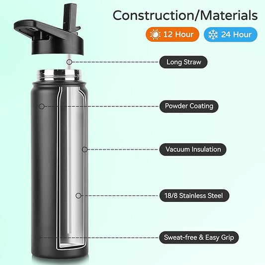 DOMICARE Insulated Water Bottle, 22 oz Vacuum Insulated Stainless Steel Reusable Sports Bottle with Straw Lid & Spout Lid for Travel, Camping, Bike, Leakproof, Black, 1 Pack…