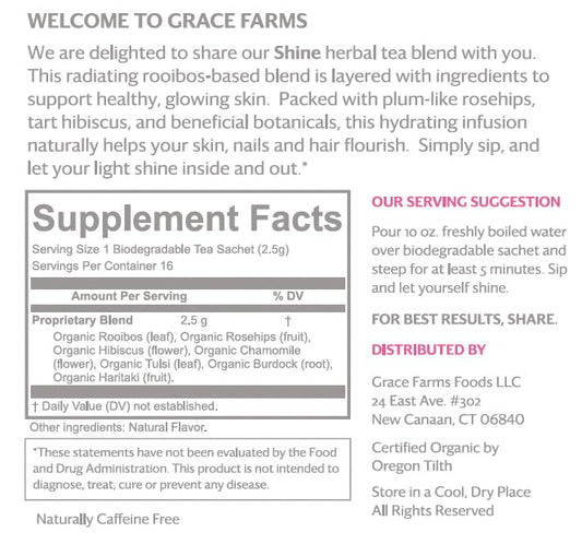 Grace Farms SHINE Wellness Organic Tea Blend (16 Pyramid Sachets) | Hydrating Tea For Skin and Detox | Rooibos, Rosehips, Hibiscus, Tulsi, and Haritaki | Fairtrade and Kosher | Gives Back 100% of Profits