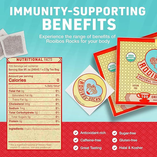 Organic Red Rooibos Tea Bags 100 Count - Naturally Sweet Herbal Tea Safe for Children & Pregnant Women - Low Tannin, Premium South African Caffeine Free Tea Bags Sustainably & Ethically Farmed