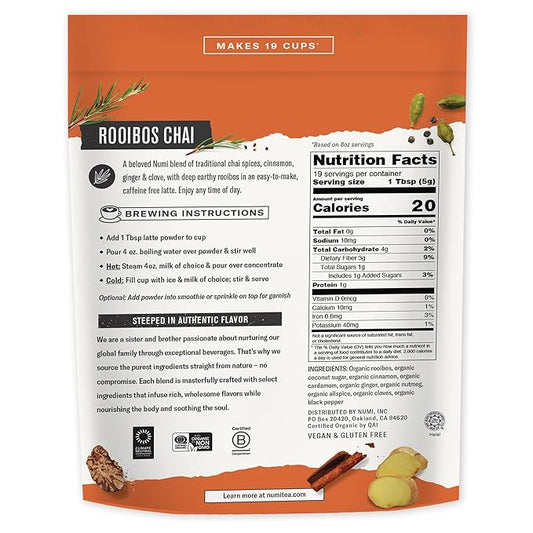 Numi Organic Rooibos Chai Tea Latte Powder – Rooibos Chai Latte Mix with Cinnamon, Cardamom & Cloves – Caffeine Free, Vegan & Gluten Free, 3.5 oz (Makes 19 Cups)
