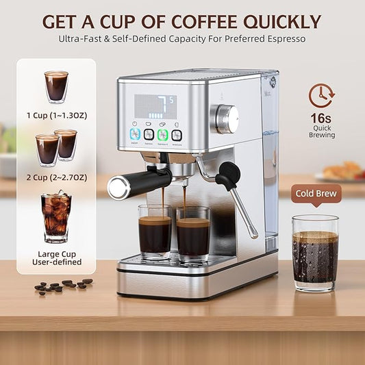 Espresso Machine, 20 Bar Espresso Maker Milk Frother & LCD Panel, Hot & Iced with Rapid Cold Brew, Stainless Steel Espresso Coffee Machine with 41oz Water Tank for Cappuccino, Latte