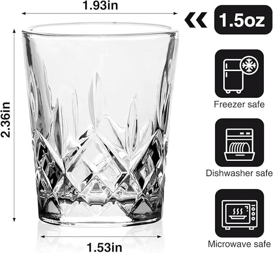 Restaurantware Timeless 2 Ounce Shot Glasses Set of 60 Etched Vintage Shot Glasses - Dishwasher-Safe Chip-Resistant Clear Glass Shot Glass Set Lead-Free For Whiskey Tequila or Vodka