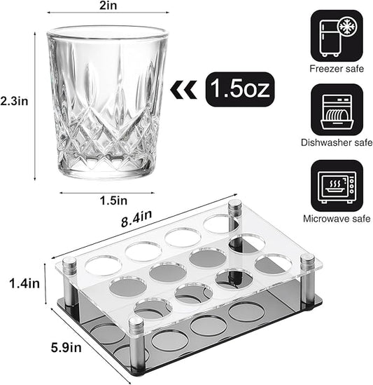 Ruckae 12 Pack 1.5 OZ Shot Glasses Set with Tray Crystal Shot Glass Bulk Clear Cone Shot Glasses for Vodka Tequila Whiskey Liquor