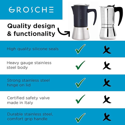 GROSCHE Milano Steel | 6 Espresso Cup | Stovetop Espresso Maker: Stainless Steel Moka Pot for Greca, Induction, Electric & Gas Stoves | Dishwasher Safe Stovetop Espresso Maker Moka Pot