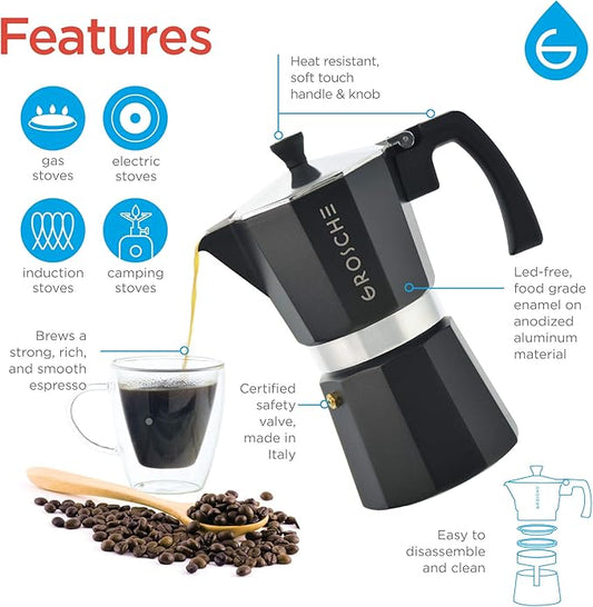GROSCHE Milano Stovetop Espresso Maker Moka Pot Cuban Coffee Maker Stovetop Coffee Maker Moka Italian Greca Brewer Percolator | 6 Espresso Cup, Black