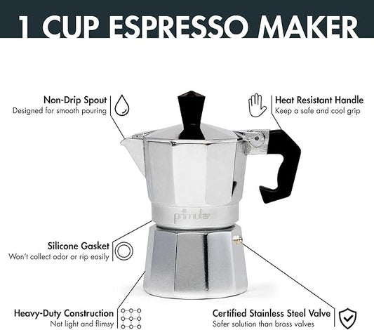 Primula Classic Stovetop Espresso and Coffee Maker, Moka Pot for Italian and Cuban Café Brewing, Greca Coffee Maker, Cafeteras, 1 Espresso Cup, Silver