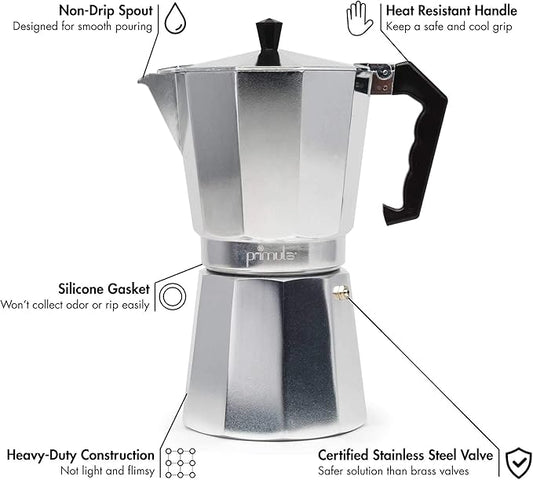 Primula Classic Stovetop Espresso and Coffee Maker, Moka Pot for Italian and Cuban Café Brewing, Greca Coffee Maker, Cafeteras, 12 Espresso Cups, Silver