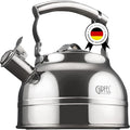 - Efficient: This stainless steel whistling tea kettle is a sleek and efficient addition to any kitchen. The 2.2L capacity is perfect for a family or surprise visitors, and it quickly boils every time. NOTE: HANDLE GETS HOT - USE A POTHOLDER