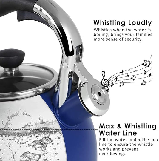 Rorence Stainless Steel Tea Kettle: 2.6 Quart Whistling Kettle with Capsule Bottom & Heat-resistant Glass Lid – Navy Blue