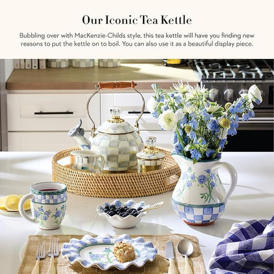 MACKENZIE-CHILDS Enamel Whistling Tea Kettle, Decorative Teapot for Stovetop, Gray-and-White Sterling Check