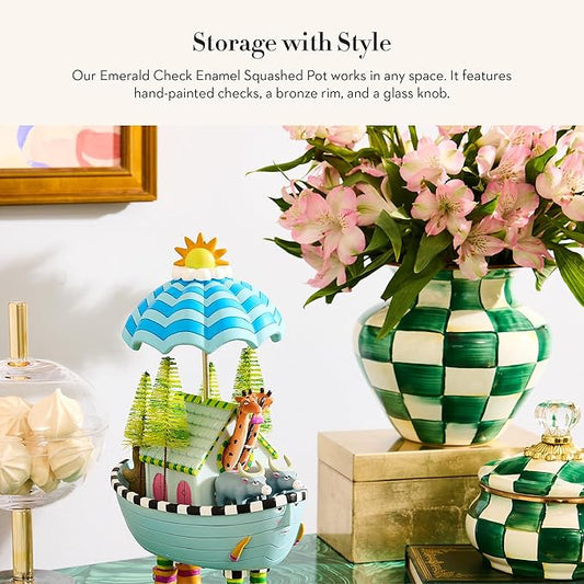 MACKENZIE-CHILDS Enamel Squashed Pot, Cute Enameled Container with Lid, 20 Ounces, Green-and-White Emerald Check