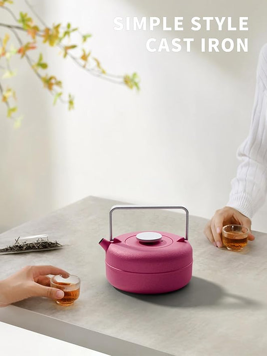 Toptier Teapot with Removable Infuser, Cast Iron Tea Kettle Stovetop Safe, Solid Geometry Cylinder Design Tea Pot Coated with Enameled Interior for 27 Ounce (800 ml), Rose Red