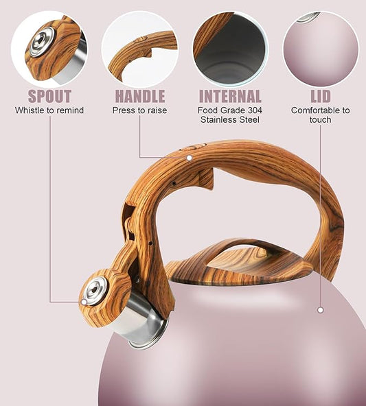 POLIVIAR Tea Kettle, 2.7 Quart Natural Stone Finish with Wood Pattern Handle Loud Whistle Food Grade Stainless Steel Teapot, Anti-Hot Handle and Anti-Rust, Suitable for All Heat Sources (JX2018-GR20)