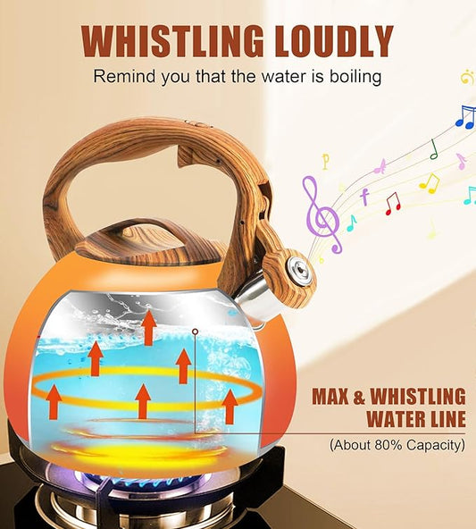 Tea Kettle Stovetop, 3.2Qt Stainless Steel Tea pots with Wood Grain Handle Food Grade Whistling Tea kettle,Induction/Gas Stoves (Orange-Red Gradient)