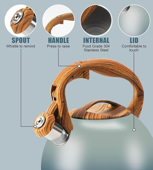 Stovetop Whistling Tea Kettle 3.2QT - Stainless Steel with Wood Grain Handle, Loud Whistle Kettle for Tea, Coffee & Milk, Ergonomic Grip & Balanced Pour Spout (Emerald Green)