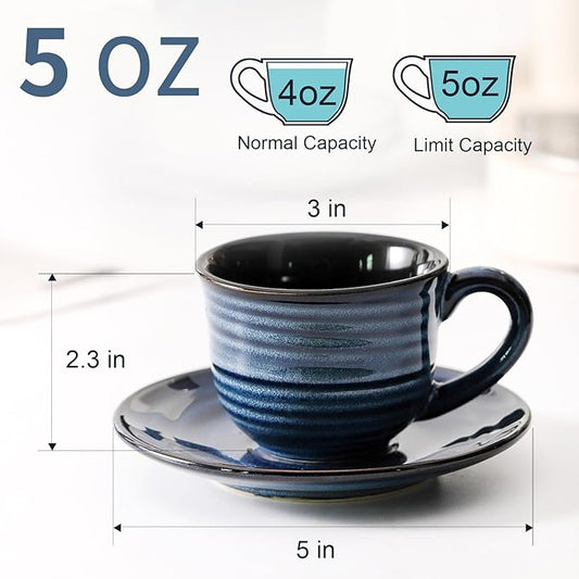 Ceramic Espresso Cups with Saucers 5 Oz,Set of 4 Cappuccino Mug with Handle for Coffee,Tea,Latte and Macchiato,Porcelain Demitasse Cups Set for Kitchen and Cafe,Navy Blue